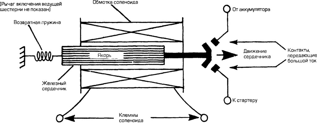 Основной элемент схемы — соленоид, определенным образом размещенный в корпусе реле. Катушка соленоида последовательно подключена с рабочей обмоткой мотор-компрессора. В момент «старта», при еще неподвижном роторе, по цепи катушки протекает максимальный ток. Создается сильное магнитное поле, которое втягивает в катушку якорь с токопроводящим контактом — он замыкает цепь пусковой обмотки. И ротор разгоняется.