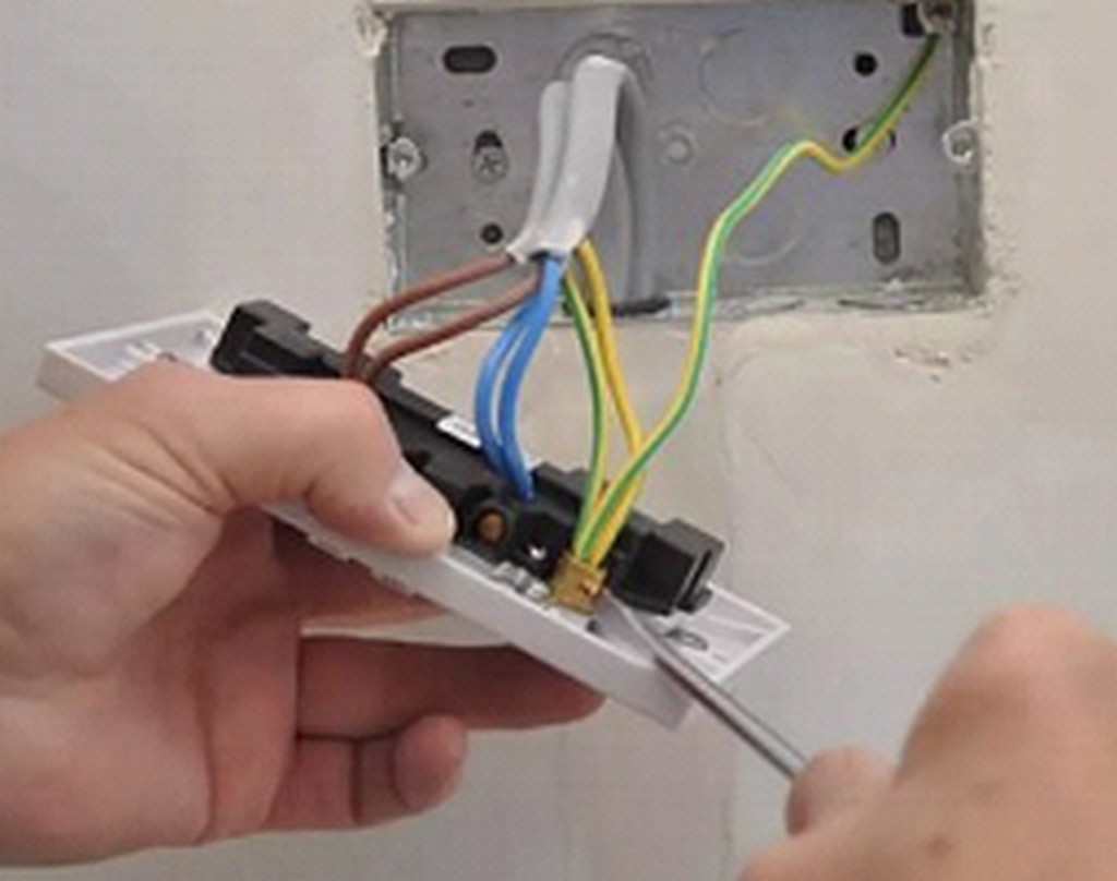 - Провода от распределительных коробок подключаем к розетке. Здесь главное — не ошибиться с подключением защитного провода, который должен крепиться к заземляющим контактам розетки. Провода к силовым контактам могут крепиться в произвольном порядке.