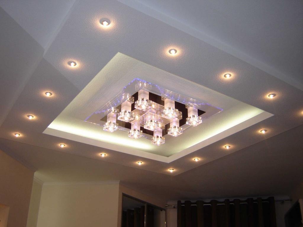 Люстра находится в центре, а места для остальных приборов определяются относительно неё. Схема может быть симметричной, когда одинаково подсвечивается пространство по разные стороны. В больших залах споты расставляют по периметру (прямоугольником или квадратом) или в форме овала (круга). При таком варианте не будет теней у стен.