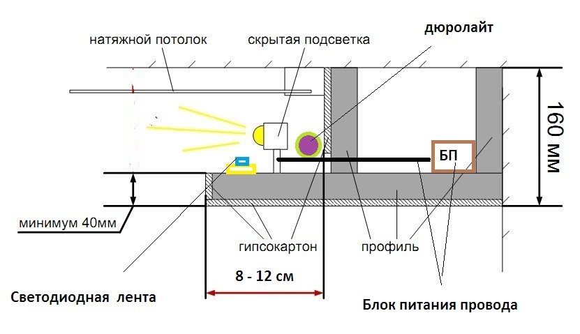 Ближе к стене (на рисунке справа), на нижней стороне короба можно установить встраиваемые точечные светильники.