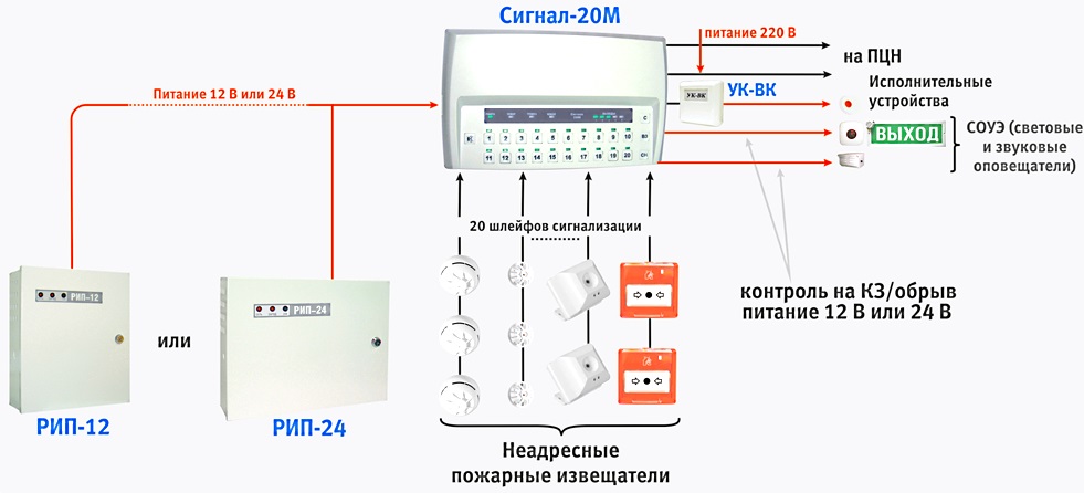 - способ контроля извещателей, которые подразделяются на адресные (микропроцессор сообщает о своем состоянии контроллеру по цифровой линии связи) и аналоговые (датчик, в зависимости от состояния меняет своё сопротивление, прибор приёмно-контрольный фиксирует это изменение) системы;
