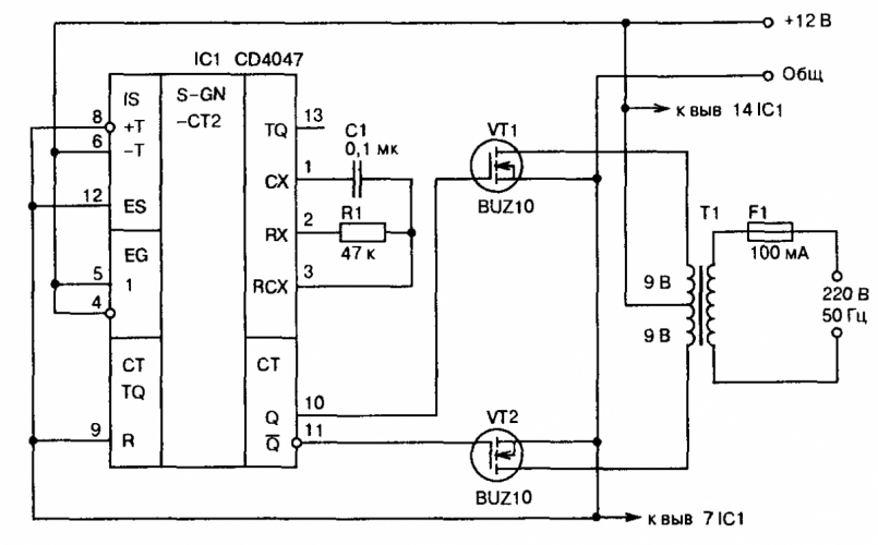Частота генерации определяется R1 – C1, надежный запуск генератора обеспечивают R2 – C2. Стабилизатор (элементы R3, VD1, C3, стабилизация 8-10 В) питает микросхему.
