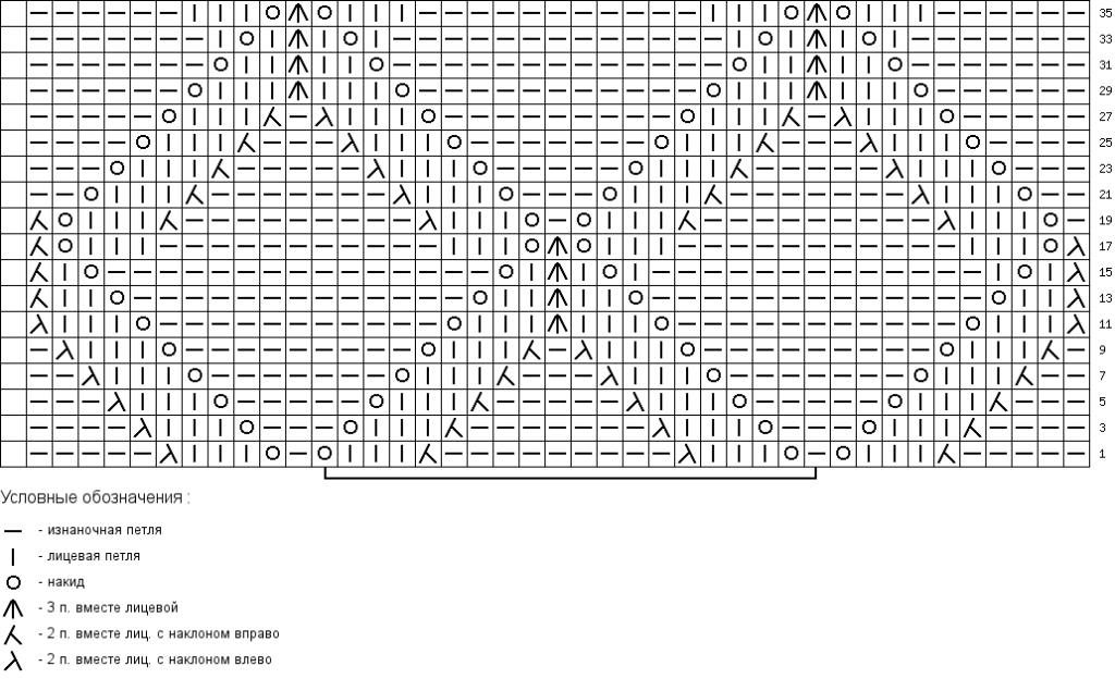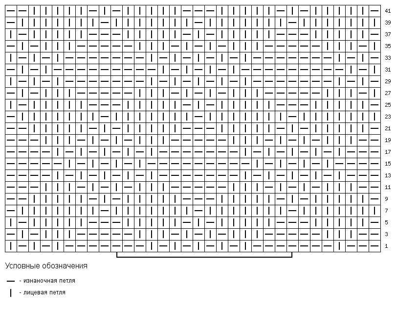Кратность набора в данном случае должна быть 10, плюс 2 кромочные. Условные обозначения вязания, как на предыдущей схеме.