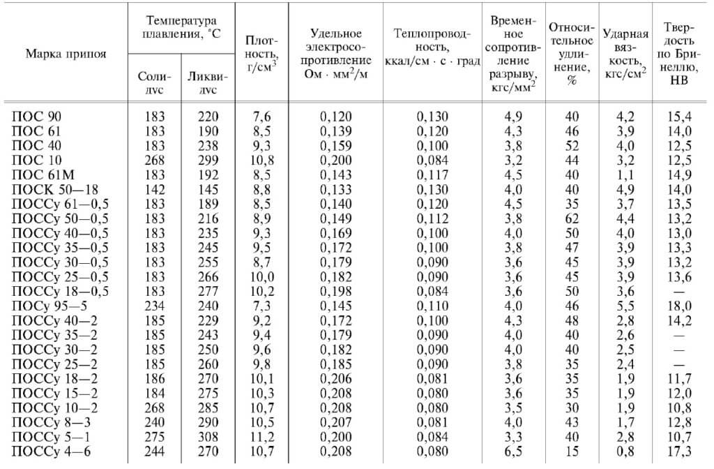 Чтобы не расписывать все технические характеристики припоев оловянно-свинцовой группы, просто приведу таблицу параметров. По ней можно определить температуру плавления, плотность, удельное электросопротивление, теплопроводность, временное сопротивление разрыву, относительное удлинение, ударную вязкость и твердость по Бринеллю припоев.