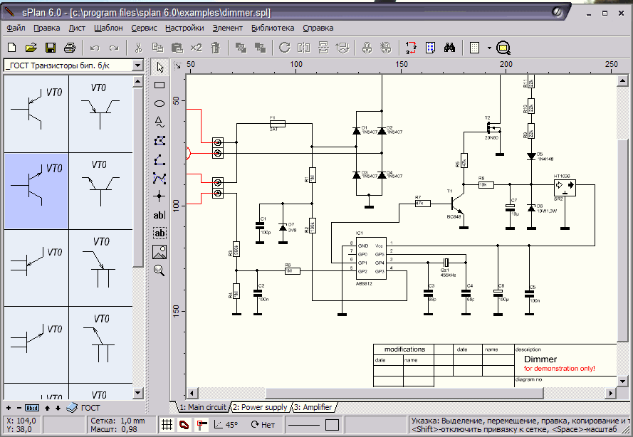Вывод: в основном эта программа подходит для студентов и начинающих радиолюбителей. Допускается одновременная работа с несколькими проектами, путем их открытия в отдельных вкладках. Вроде все неплохо, но у D Circuits есть серьезные недостатки. Процесс создания схемы стандартный — перетаскиваем из библиотеки нужные элементы на поле, разворачиваем их в требуемом направлении и устанавливаем на места.
