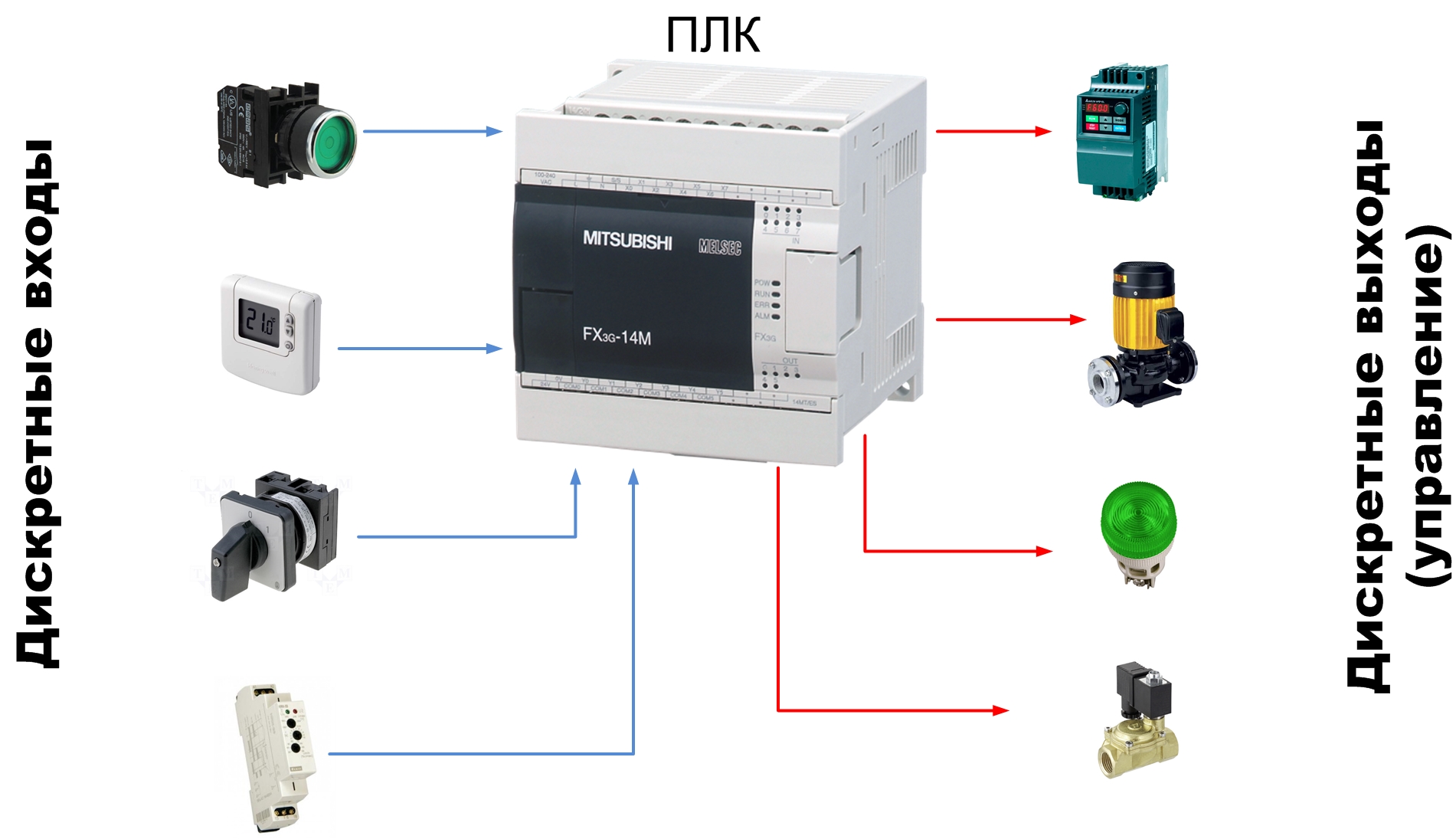 Дискретные входы – предназначены для ввода сигналов от дискретных датчиков (кнопки, тумблеры, концевые выключатели, термостаты и др.). Напряжение сигнала унифицировано для всех ПЛК и составляет 24 В. Проще говоря, при «появлении» на входе контроллера напряжение 24 В – ПЛК будет считать этот вход «включенным», то есть он примет значение логической «1» в восприятии контроллера.