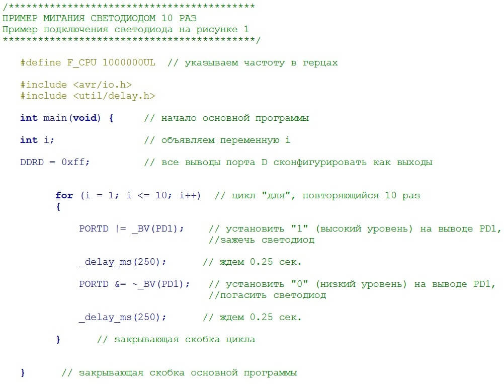 Усовершенствуем программу управления миганием светодиода, рассмотренную в статье про программирование портов микроконтроллеров AVR, с помощью цикла типа «для» (for). Заставим светодиод мигать 10 раз.