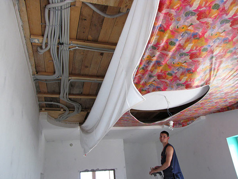 Результат такого монтажа будет напрямую зависеть от качества существующей проводки. В закрытом пространстве между плитами перекрытия и ПВХ-пленкой нет резких перепадов температуры и уровня влажности, отсутствует возможность механических повреждений.