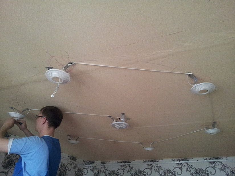 Точечные светильники обычно устанавливают с подвесными или натяжными потолками. Если потолки натяжные, все провода укладывают заранее. Их крепят к потолку, не подключая к питанию, размещают и закрепляют на подвесах светильники, затем подключают к ним провода и проверяют работу.