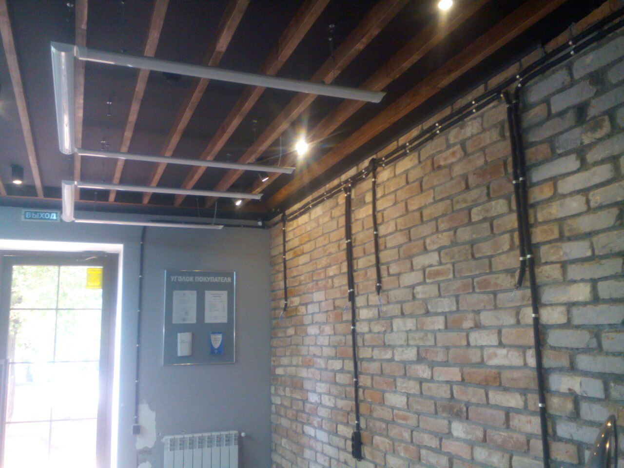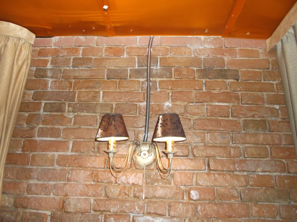 Знакомый дизайнер сказал, что если на кирпичной стене наружная проводка в трубах или металлорукаве — значит стиль лофт. И никаких гвоздей.