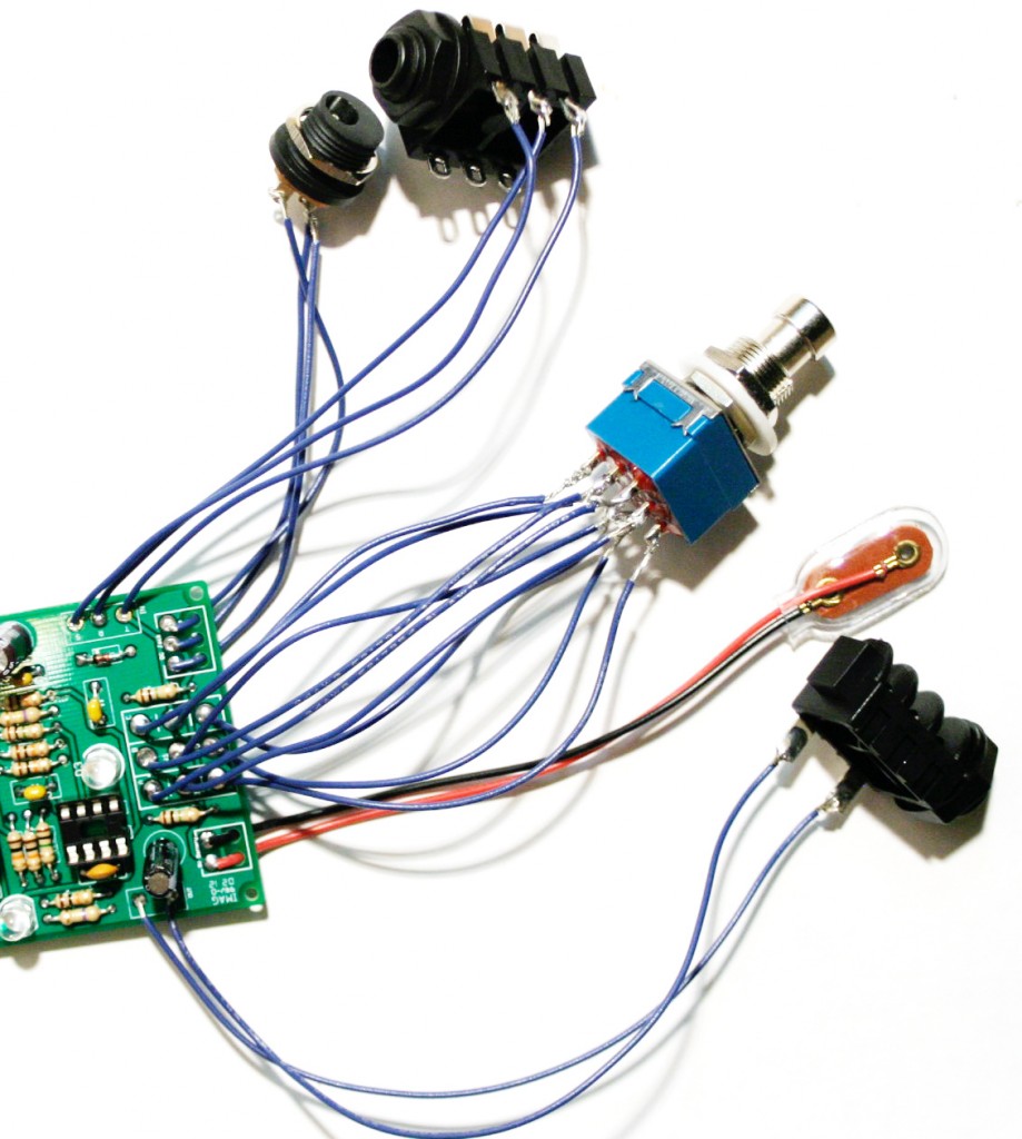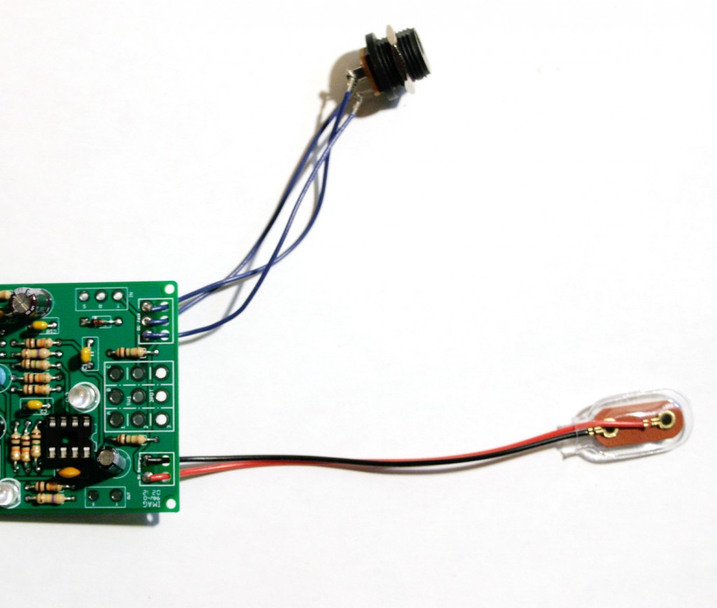 The wiring for the three-terminal stereo jack is very important for the circuit to function. The circuit will not receive power until a mono cable is plugged into the ‘IN’ jack, saving battery power when the circuit is not being used. If you are using a mono jack for ‘IN’, solder a jumper wire from ‘R’ to ‘S’.