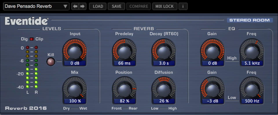 - Low Damp (HPF) — демпфирование низкочастотных составляющих спектра реверберации (иногда есть параметры раздельно регулирующие уровень и частоту).