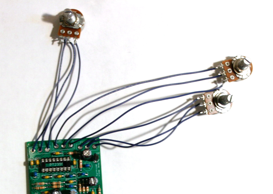 Solder three wires to each solder terminal of the potentiometers and insert them into the PCB as shown in the picture above. Solder them to the PCB. You make find that you need to twist the stranded wire very tight to get the wire through the PCB.