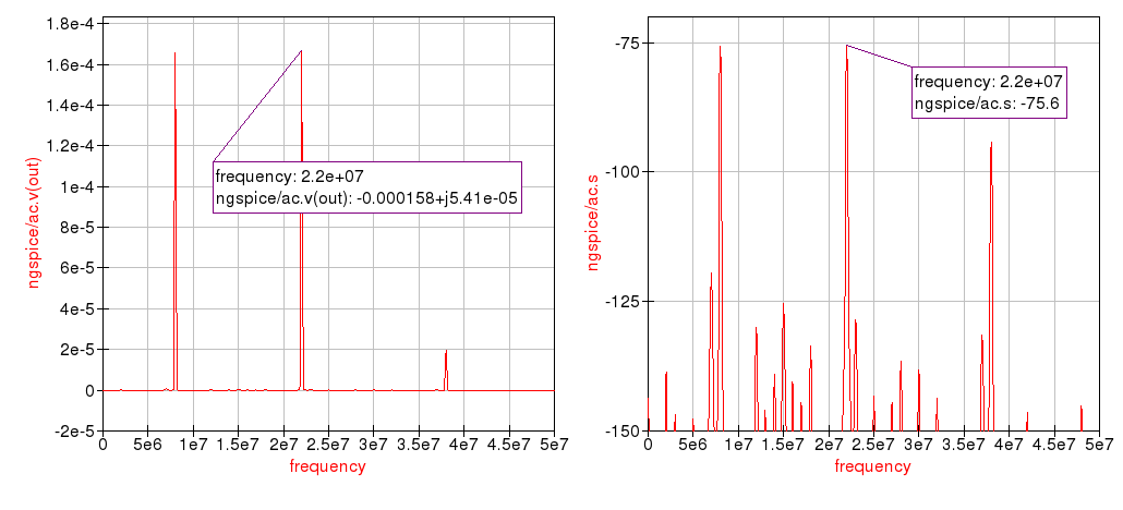Figure 13.7 Output voltage spectrum at Node2 for Qucs (left plot), and measured with voltage probe Pr1 for Xyce (right plot).