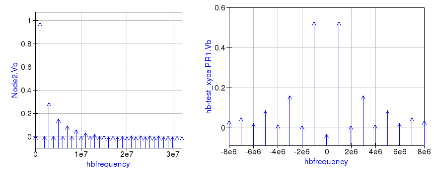 In contrast to Qucs, Xyce outputs HB voltage and current simulation data as plots of complex conjugate spectral components, where
