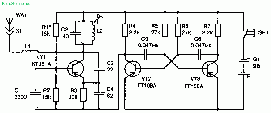 Для подавления мешающего напряжения с частотой гашения между сверхрегенеративным детектором и усилителем напряжения включен фильтр L3, С7.