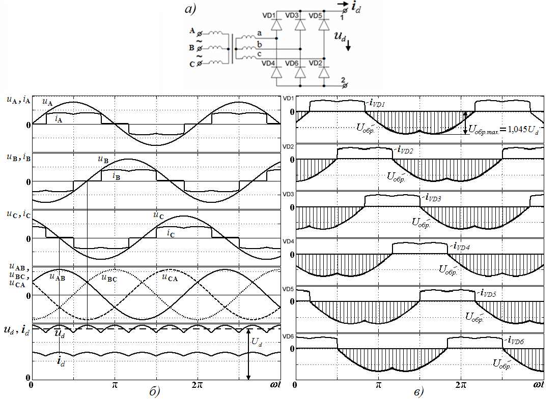 Диаграммы напряжений и токов, поясняющие работу идеализированного трехфазного мостового выпрямителя на активную нагрузку, представлены на рис. 1.6 (б, в).