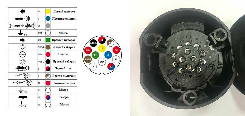Розетка фаркопа на 13 пин имеет следующие разъемы: