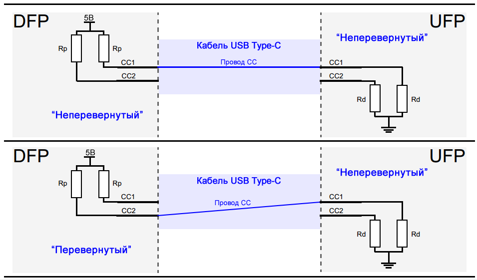 DFP подтягивает выводы CC1 и CC2 к шине 5 В через резисторы Rp, но UFP подтягивает их к шине GND через резисторы Rd. Если кабель не подключен, источник видит высокий логический уровень на выводах CC1 и CC2. Подключение кабеля USB Type-C создает путь для протекания тока от источника 5 В до земли. Поскольку в кабеле USB Type-C имеется только один провод CC, формируется только один путь протекания тока. Например, в верхней части рисунка 5 вывод CC1 DFP подключен к выводу CC1 UFP. Следовательно, вывод CC1 DFP будет иметь напряжение ниже 5 В, но вывод CC2 DFP будет по-прежнему иметь высокий логический уровень. Поэтому, отслеживая напряжение на выводах DFP CC1 и CC2, мы можем определить подключение кабеля и его ориентацию.