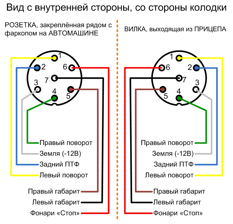 Схема подсоединения прицепа российской 7-контактной розетки выполнена таким образом: