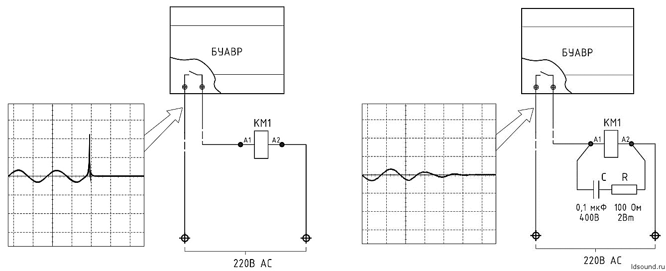 Дугогасящая RC-цепочка работает в момент размыкания контактов, отключающих катушку, поглощает и подавляет энергию дуги, замыкает выброс напряжения на себя, позволяя паразитной энергии обойти управляющий контакт.