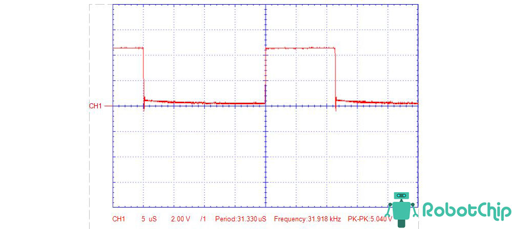 Перемычка установлен на 1 кГц — 10 кГц, потенциометр частоты на максимуме, а потенциометр скважности выкручен максимально (до спада импульса)