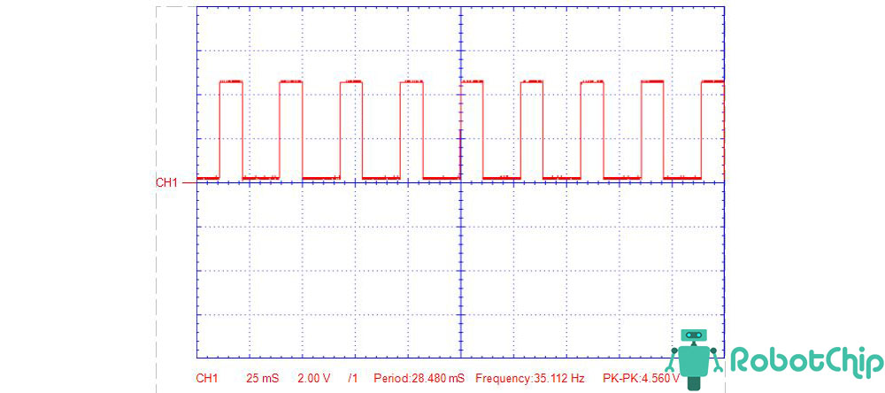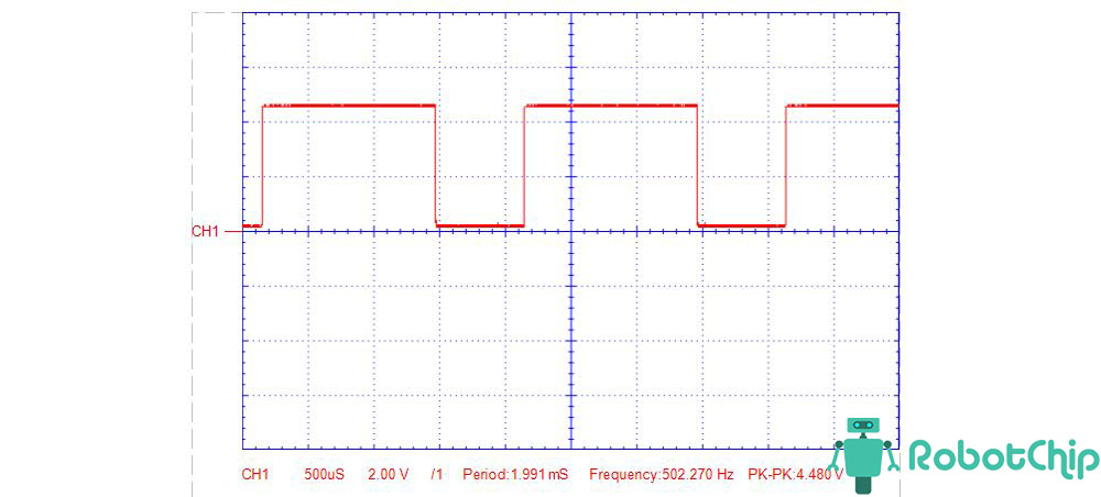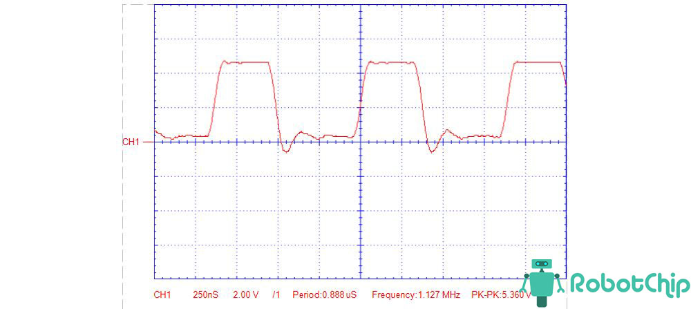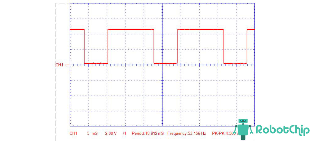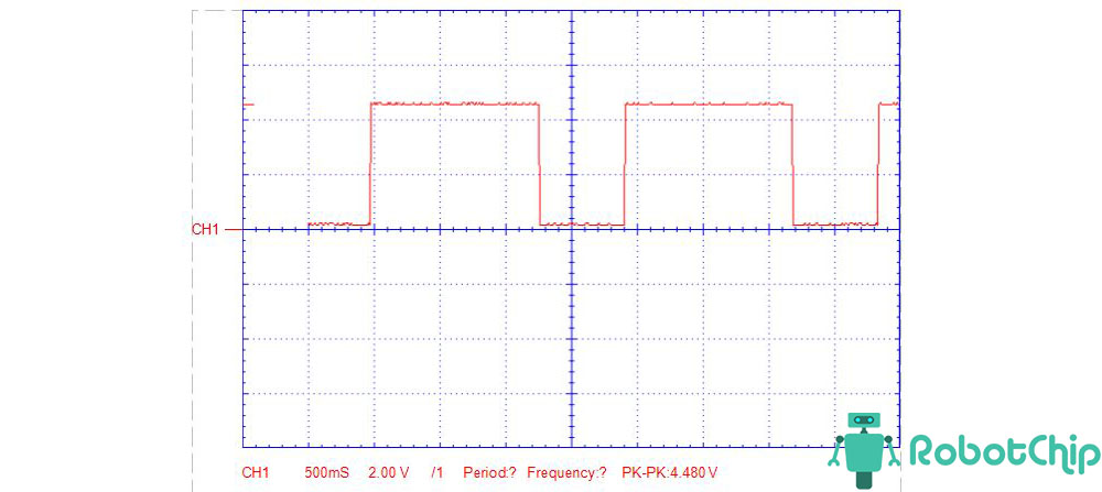 Покажу показания выходного сигнала снятые с помощью осциллографа, потенциометр частоты и скважности выкрутил на минимум и на максимум.1. Перемычка установлен на 1 Гц — 50 Гц, потенциометры на минимуме