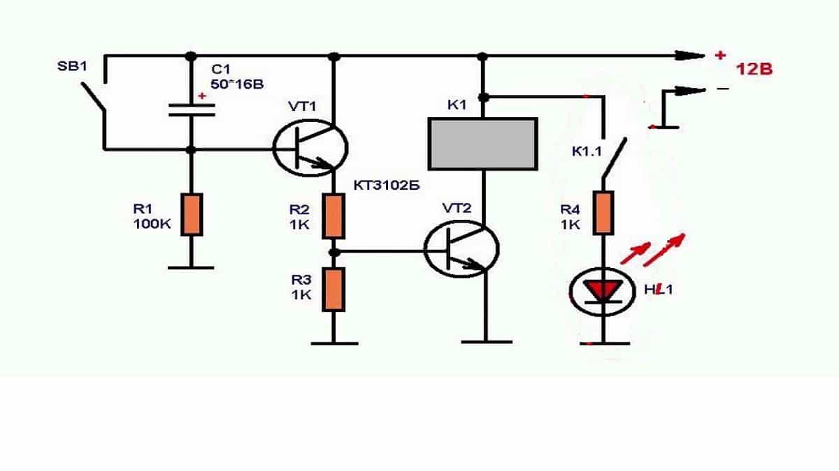 Принцип работы такого реле времени заключается в подаче напряжения 12 В на емкостной элемент C1. После чего происходит зарядка конденсатора до определенного потенциала, величины которого будет достаточно для открытия транзистора VT1.