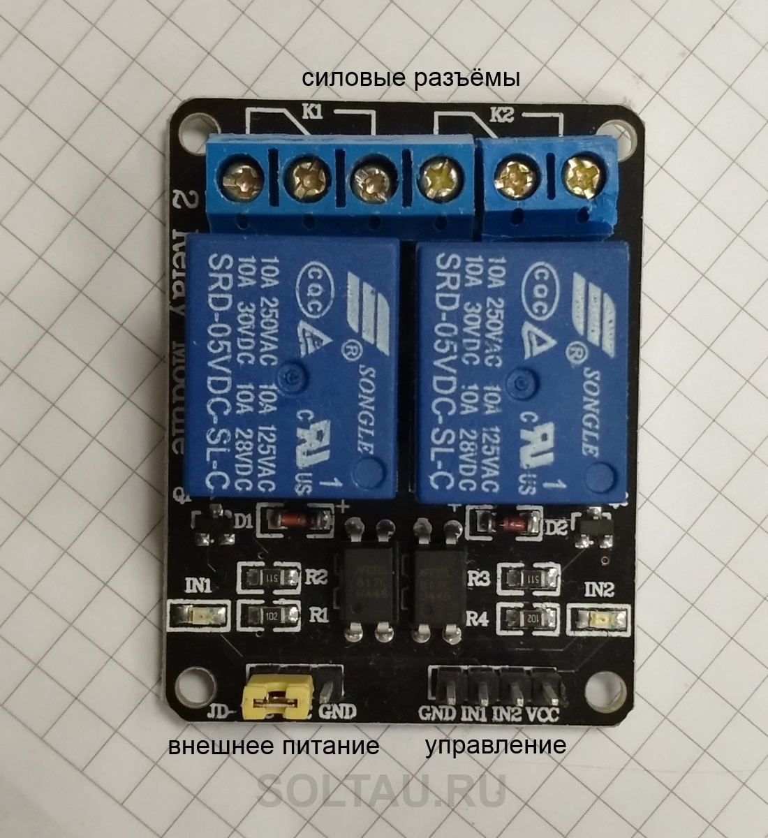 Будем использовать модуль с двумя одинаковыми реле типа SRD-05VDC-SL-C или аналогичный.