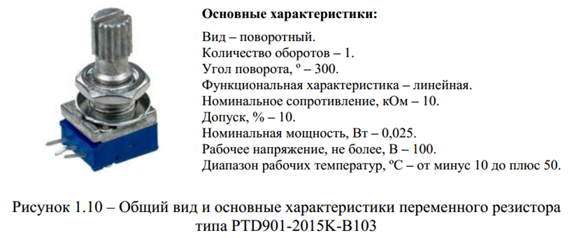 В качестве примера рассмотрим общий вид и основные характеристики регулировочного резистора типа PTD901-2015K-B103, которые приведены на рисунке 1.10.