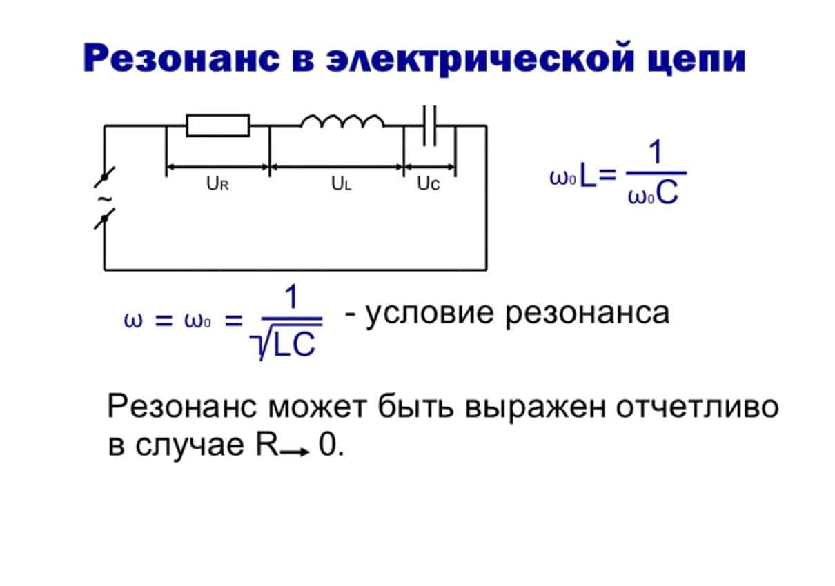 В электрических цепях резонансом называется такой режим пассивной цепи, содержащий катушки индуктивности и конденсаторы, при котором ее входное реактивное сопротивление или ее входная реактивная проводимость равны нулю. При резонансе ток на входе цепи, если он отличен от нуля, совпадает по фазе с напряжением.