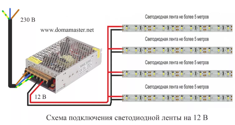 определяет простоту подключения устройства. Абсолютное большинство светодиодных лент работают от 12 Вольт. И найти подходящий блок питания для них труда не составит.