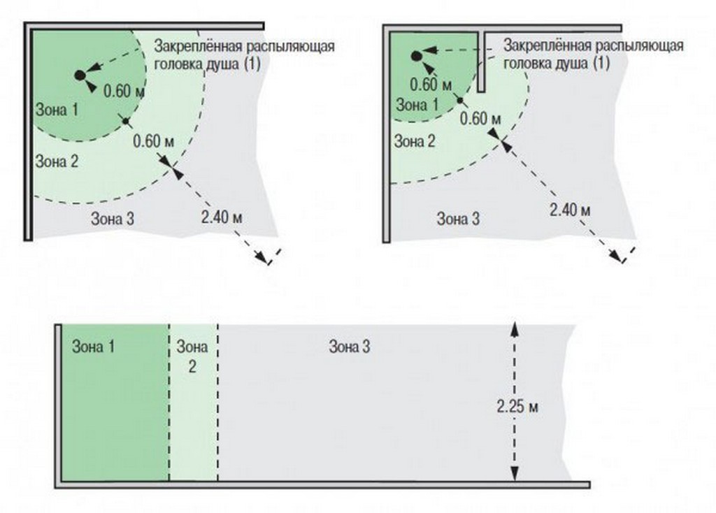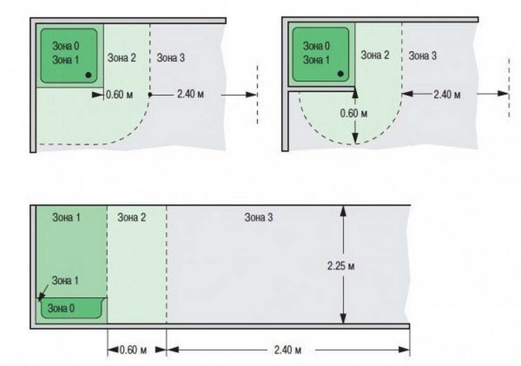 - Первая зона – это участки прилегающие к нулевым зонам в которых возможен контакт с водой в результате разбрызгивания. Эта зона располагается в пределах 60 см от источника воды и расположение водорозеток в ванне тут крайне не рекомендуется. Допускается только установка бойлера;