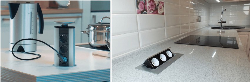 - выдвижные розетки – это более продвинутый вариант, который является достойной альтернативой удлинителям, и позволяют одновременно подключить несколько электроприборов. Обычно их скрывают в столешнице или в шкафчике, чтобы защитить от воздействия пыли и влаги;