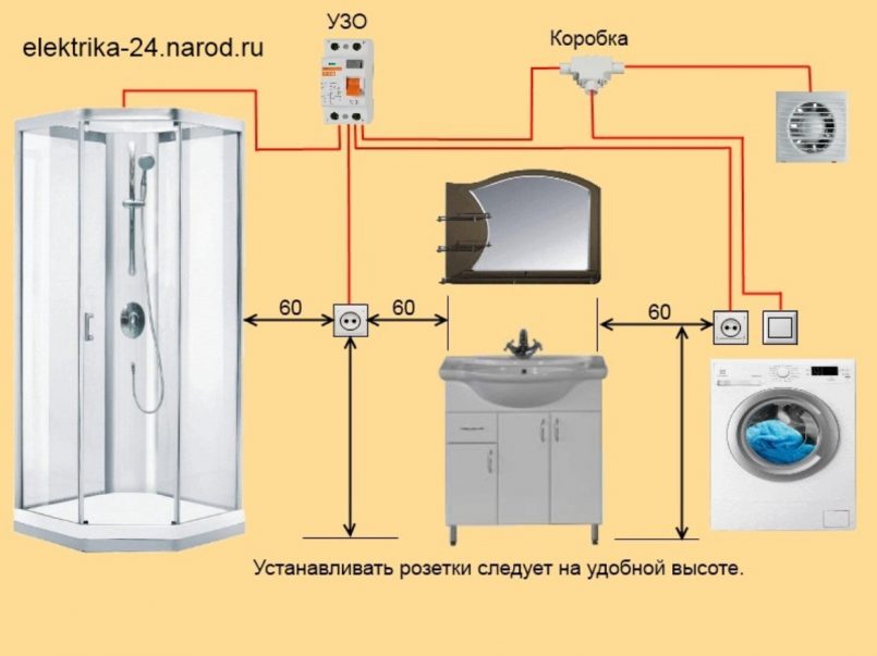 - минимально допустимое расстояние от двери кабинки до электророзетки – 0,6 метра; электророзетки в таком случае обязательно дополняются устройством защитного отключения.