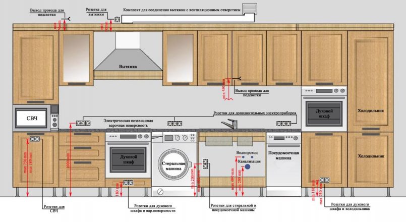 Схема должна быть составлена таким образом, чтобы не было никаких дополнительных удлинителей и переносок. Также для кухни очень остро стоит вопрос: на какой высоте сделать розетку?