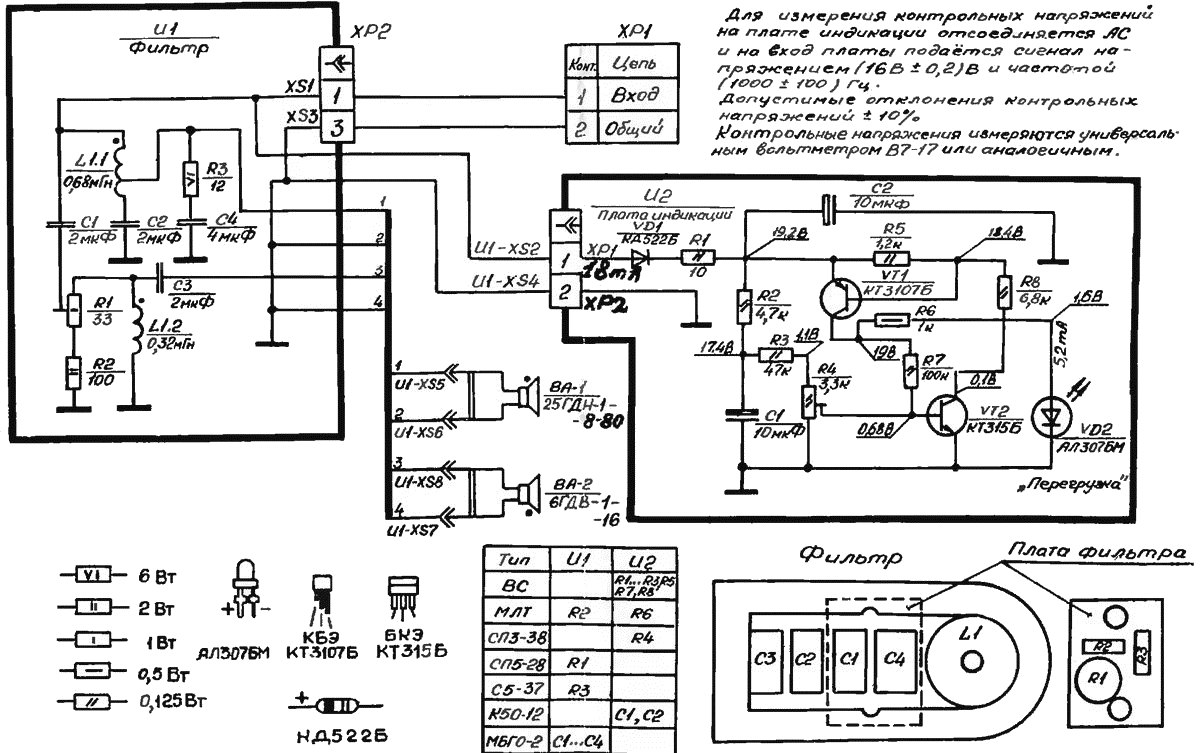 - Теперь перейдем к плате фильтров. Вот кстати схема:Возможно, формат этой картинки не поддерживается браузером. Оговорюсь сразу, что плату защиты лучше выкинуть (впрочем можно и оставить чтоб не зияла дыра на месте светодиода, но не подключайте ее). Убедитесь что в конструкции фильтра не использовались железные части, т.к. это влияет на параметры катушек. После чего приклеиваем плату к корпусу ас изнутри (лучше сместить от оси нч динамика, но смотрите, чтоб она не помешала фазоинвертору). После этого припаиваем провода от клемника. Советую провода для динамиков распаять еще до помещения фильтра в ас. Провода возьмите акустические из бескислородной меди, сечением 2мм2. Провода паяйте, любые разъемы недопустимы.