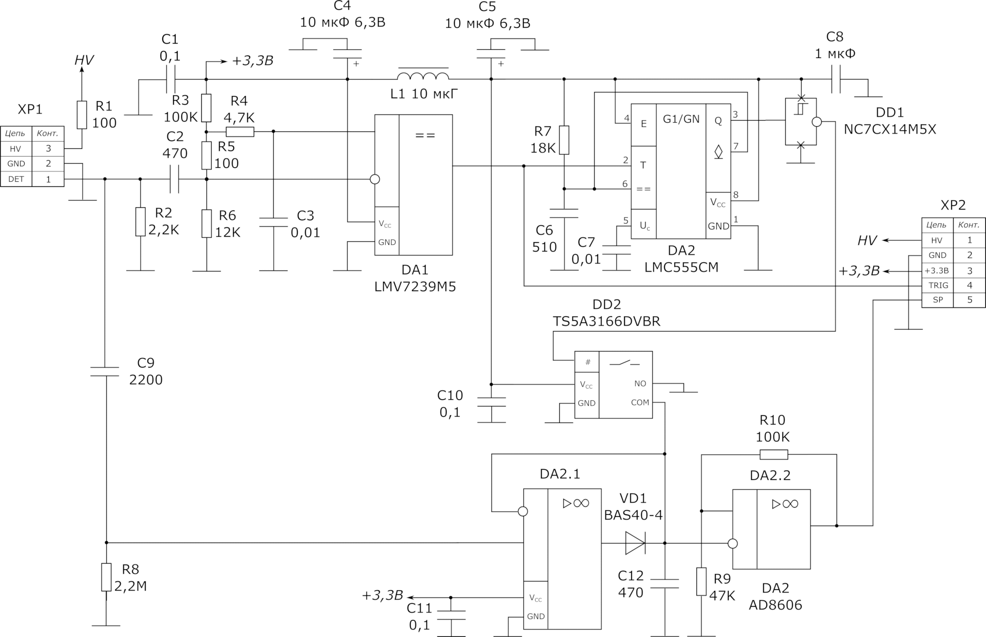 При закрывании транзистора в обмотке I трансформатора формируется ЭДС самоиндукции, приводящая к короткому импульсу положительной полярности амплитудой порядка 60 В на стоке VT2. Это напряжение повышается обмоткой II и поступает на утроитель напряжения на диодах VD3-VD5 и конденсаторах C12-C14. Использование утроителя напряжения снижает требования к трансформатору и упрощает его конструкцию. Высокое напряжение порядка 400 В поступает на счетчик Гейгера BD1 через нагрузочный резистор R10.