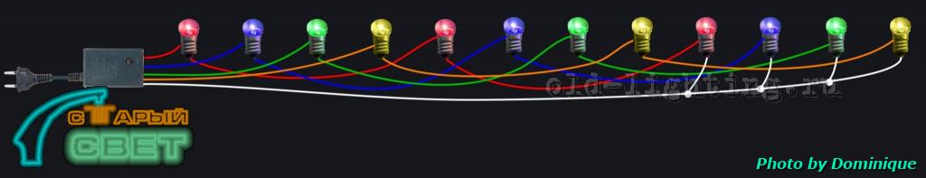 Старые советские гирлянды на елку (без коробки) в этом плане более удобные, т.к. в них все лампы вкручиваются в патроны, и определить, какая лампочка не работает можно без паяльника и омметра методом исключения – взяв рабочий источник света и поочередно вкручивая его во все патроны. Другой же метод ремонта – с помощью тестера замерить сопротивление каждой лампы, пока не найдете перегоревшую.