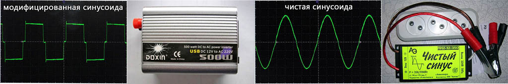 Тихая, но существенная в данной отрасли революция произошла, когда специально для инверторов напряжения были разработаны микросхемы, формирующие т. наз. модифицированную синусоиду (слева на рис.), хотя правильнее было бы назвать ее псевдо-, мета-, квази- и т.п. синусоидой. Форма тока модифицированной синусоиды ступенчатая, а фронты импульсов затянуты (фронтов меандра на экране электронно-лучевого осциллографа часто вообще не видно). Благодаря этому потребители с трансформаторами на железе или заметной реактивностью (асинхронными электромоторами) «понимают» псевдосинусоиду «как настоящую» и работают как ни в чем не бывало; Hi-Fi аудио с сетевым трансформатором на железе запитывать модифицированной синусоидой можно. Кроме того, модифицированную синусоиду возможно достаточно простыми способами сгладить до «почти настоящей», отличия которой от чистой на осциллографе на глаз еле заметны; преобразователи типа «Чистый синус» стоят ненамного дороже обычных, справа на рис.