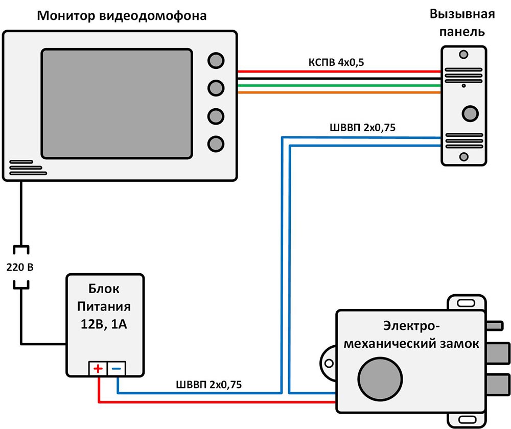 Соединить замок, блок питания и домофон можно двухжильным кабелем с сечением не менее 0,75 кв. мм. Обычно мастера используют самый простой провод ШВВП: одну жилу используют для передачи питания на замок, вторую — для сигнала.