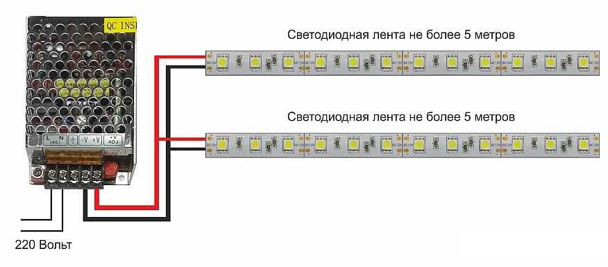 В таком случае удобно блок питания располагать посредине, например, в углу, а от него — две ленты по обе стороны. Но часто дешевле купить несколько менее адаптеров, чем один более мощный.