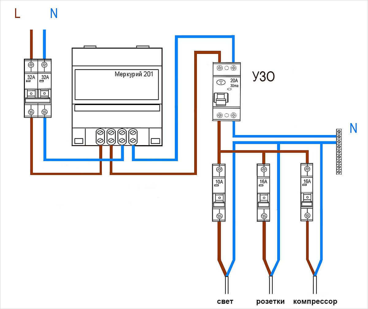 В однофазных сетях УЗО устанавливается сразу после электросчётчика перед группой автоматических выключателей