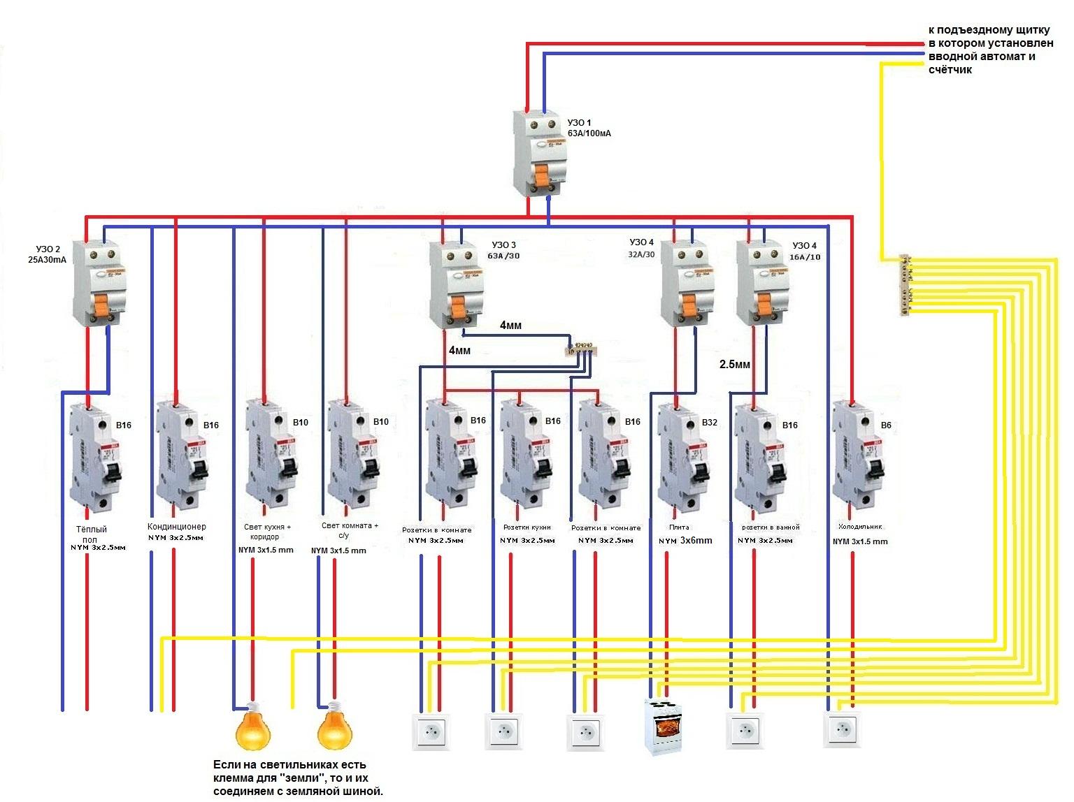 В этом случае его рабочий ток должен быть больше, чем номинал каждого из установленных после устройства защиты автоматов. По такой схеме провода с выхода счётчика подключаются на верхние контакты условный вход общего УЗО. Применения четырехполюсного УЗО в однофазной цепи, в большинстве случаев нерентабельно. Несомненный плюс такой схемы в том, что в момент повреждения будет отключаться только аварийная линия, а во всей остальной квартире подача напряжения не прекратится.