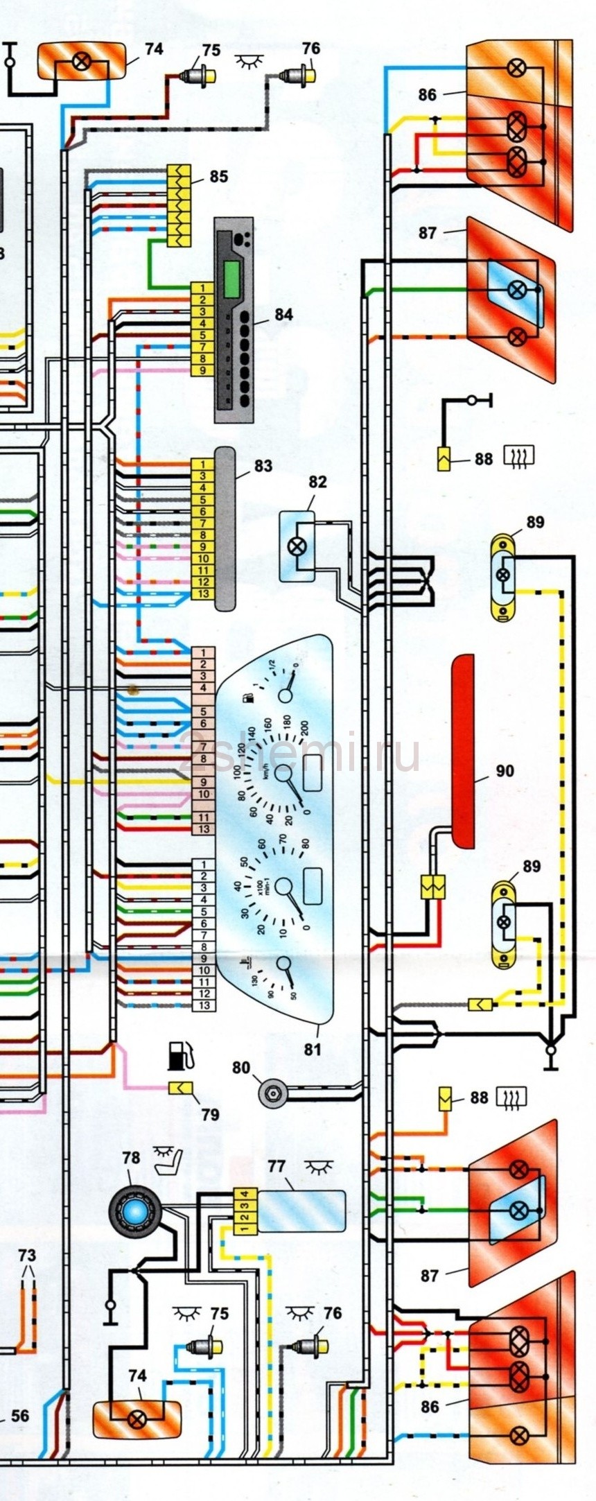 С середины 90-х годов на ВАЗ 2109 стали применяться двигатели с системой впрыска, что сильно изменило электрический план моторного отсека и панели приборов. Ниже представлена схема электрики машины 1999 года с ЭСУД типа GM ISFI-2S и Январь 4/4.1.