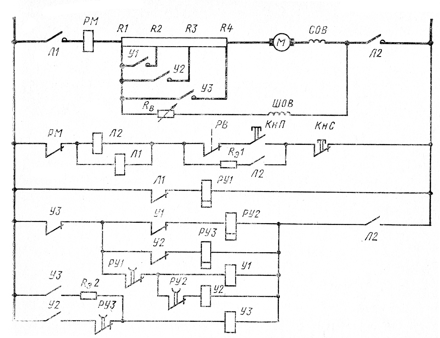 По истечении некоторого времени контакты К размыкаются и замыкаются контакты КУ. Начинается разгон через ограничивающие резисторы R1—R4.