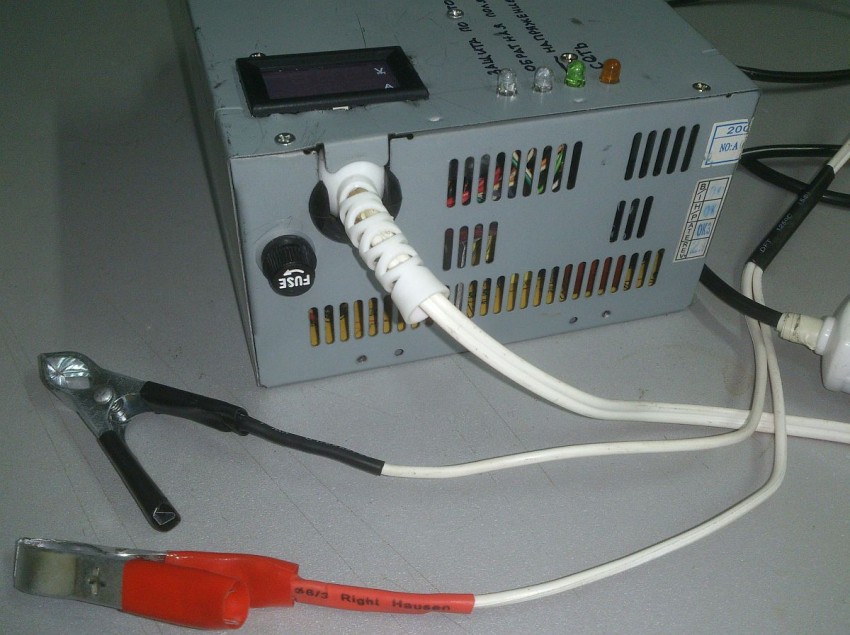 Момент полного заряда батареи определяется необходимым напряжением на ней. Требуемая величина выставляется переменным резистором на 10 кОм. Чтобы её проверить, понадобится поставить вольтметр на клеммах подключения батареи, не подключая её саму. В качестве источника постоянного напряжения используется любой выпрямительный блок, рассчитанный на ток не менее одного ампера.