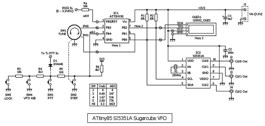 Управление синтезатором осуществляется микропроцессором ATtiny85, а информация отображается на миниатюрном OLED дисплее. Несмотря на малый объем памяти процессора и весьма ограниченное количество портов, автору удалось создать полноценный синтезатор для трансивера с весьма богатым набором функций: