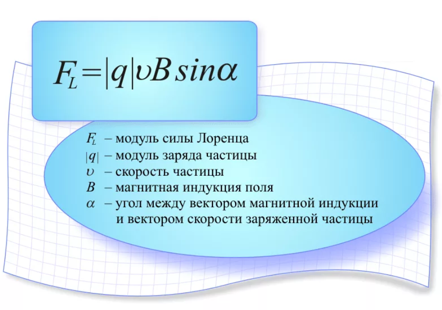 На основании полученных данных голландским ученым Хендриком Лоренцем была выведена формула: FL = |q|x V x B x sinα. Все условные обозначения приведены на рисунке.