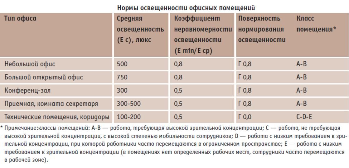В СНиП регламентированы все основные показатели. Нужно найти тип помещения, чтобы узнать минимально допустимое значение, от которого следует отталкиваться при проектировании. При этом диапазон может быть достаточно большим, все зависит от специфики выполняемых работ и других особенностей. Ниже указана освещенность в люксах – таблица показывает значения для основных типов помещений.